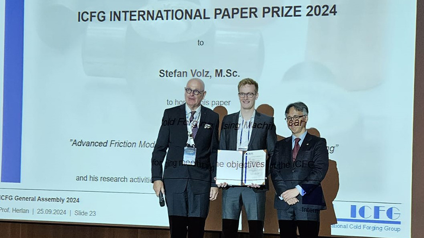 A highlight of the event was the awarding of the ICFG's Best Paper Prize 2024 to our colleague Stefan Volz. In his awarded paper, “Advanced friction modelling for cold forging using machine learning”, Mr. Volz presents an innovative method for friction modelling using machine learning. With the help of time series analyses, he succeeds in significantly reducing the number of tribometer tests required for ML algorithms and thus making data acquisition more efficient. Stefan Volz was also recognised for his outstanding contributions to the ICFG over the past three years. During this time, as part of the “Lubrication” subgroup, he organised an international research group with companies and universities from China, Denmark, France, Japan and Germany. The research results of this group have been published in various publications, including the renowned CIRP Annals and at the ICFG.
